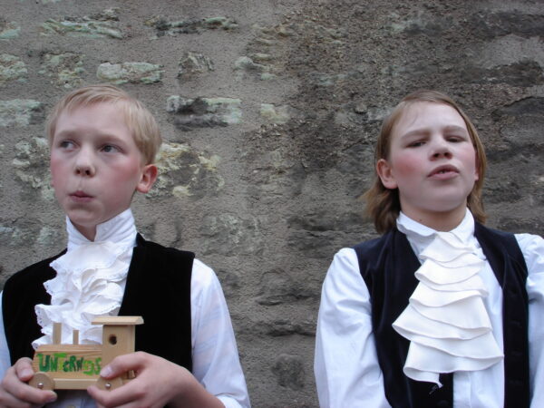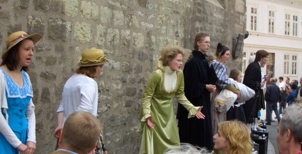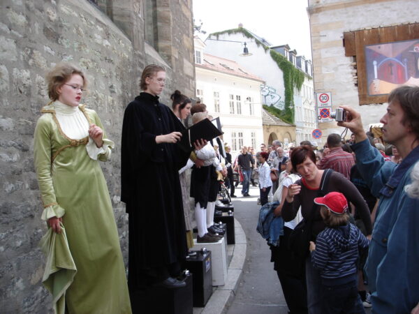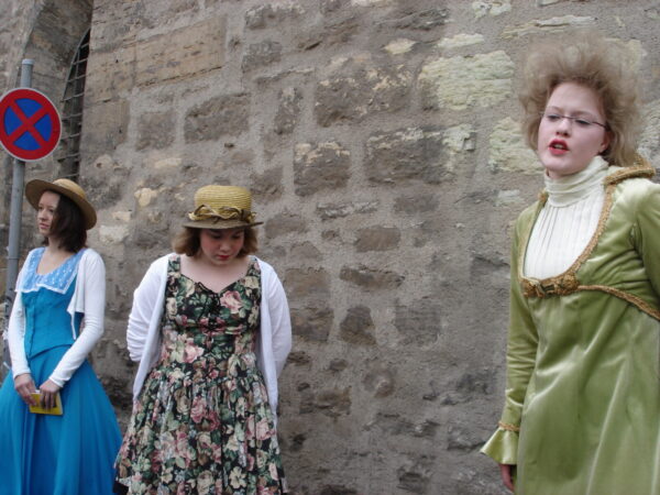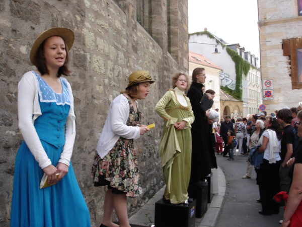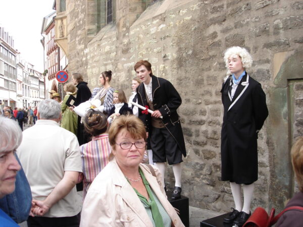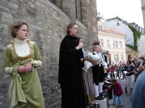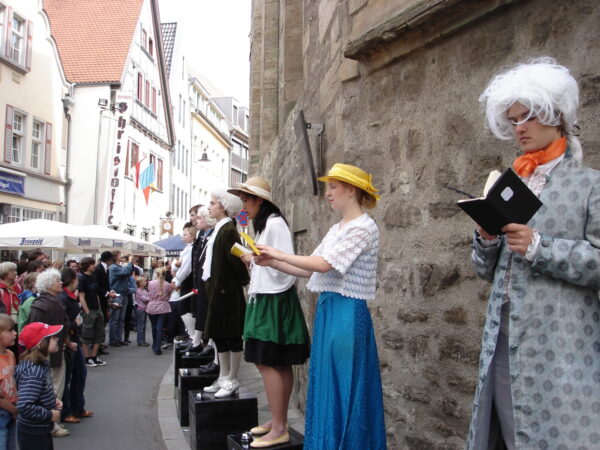 Im November 2009 feierten wir den 250. Geburtstag Friedrich Schillers. Da der Dichter geraume Zeit auch in Erfurt zugebracht hat, wollten wir diesen Jahrestag zum Anlass nehmen, um ihm mit einer Aktion des Straßentheaters zu gedenken und sein Verhältnis zur Stadt Erfurt weiter lebendig zu halten. Schiller hat sich in Erfurt mit Charlotte Lengefeld verlobt, seinen Don Karlos im Ballhaus zur Uraufführung gebracht, seine Abhandlung über den Dreißigjährigen Krieg verfasst sowie mit Dalberg und den Brüdern Humboldt engen und regen Gedankenaustausch gepflegt. Davon ließen wir uns inspirieren und entwickelten szenische Arrangements, die verschiedene Aspekte seines Lebens und seiner Werke knapp und unterhaltsam streiften. Sie wurden auf einem speziell dafür erfundenen „Schiller-Platz“ zum Besten gegeben.Unsere Darsteller verwandelten sich in Figuren und Sprecher, trugen Balladen vor und brachten den Menschen Schiller näher.