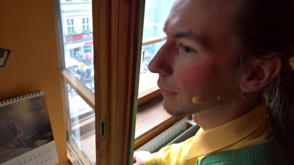 Da ruft ihm seine schwedische Praktikantin – Pippi Langstrumpf – aus der Ferne zu, dass sie im Fluss nach Krebsen gesucht und dabei den Stein gefunden hat, über den der Esel gestolpert ist. Das ist kein Zufall, denkt sie, sondern ein Wink: das ist ein Stolperstein.